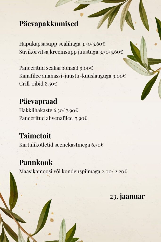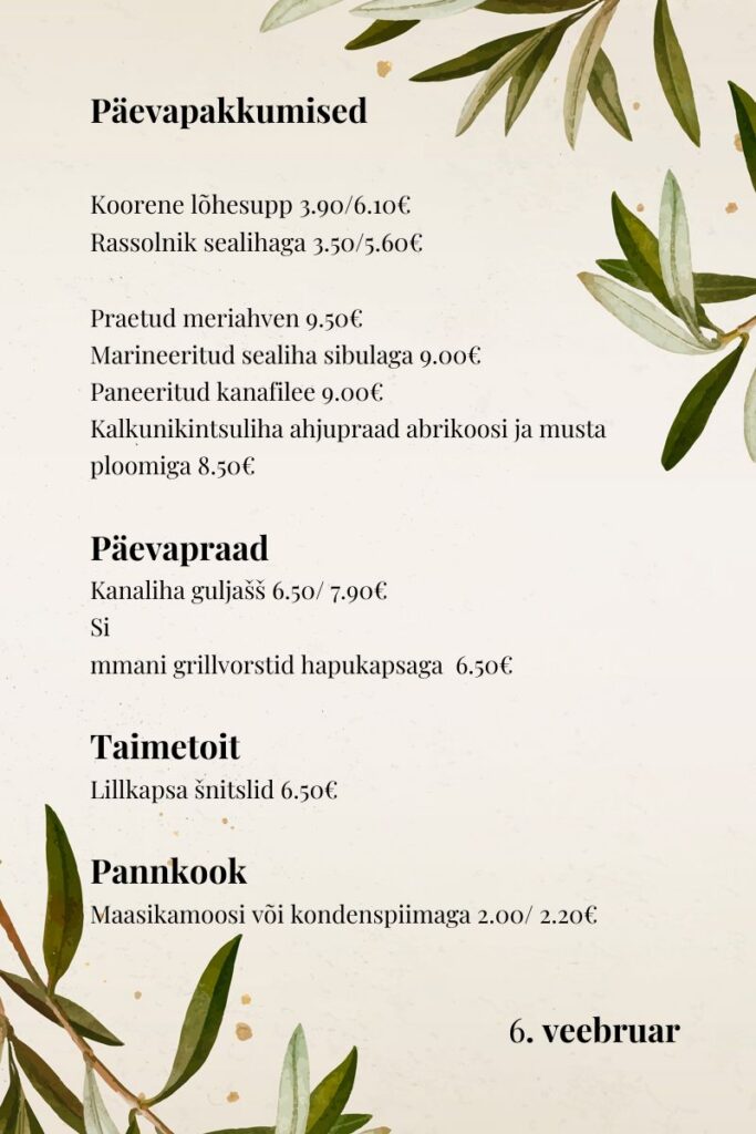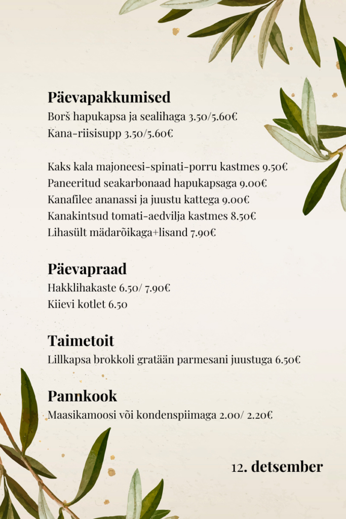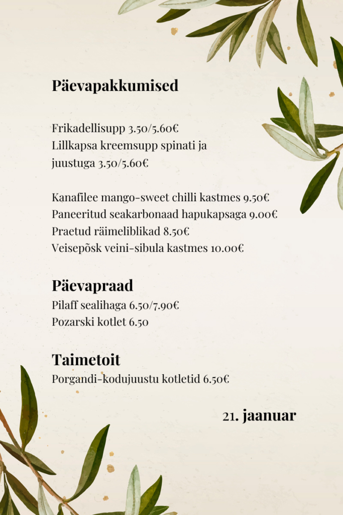 Helios Kohvik Maitsvad kodused toidud! Happy Hour 15.30-17.00 -20% v.a. päevapraed Avatud E-R kell 9-17 Vaata asukohta kaardil Catering teenus Koostame menüü vastavalt soovile ja eelarvele! Telli catering Vaata lähemalt Ruumide rent Korralda siin seminare, koosolekuid ja kohtumisi.